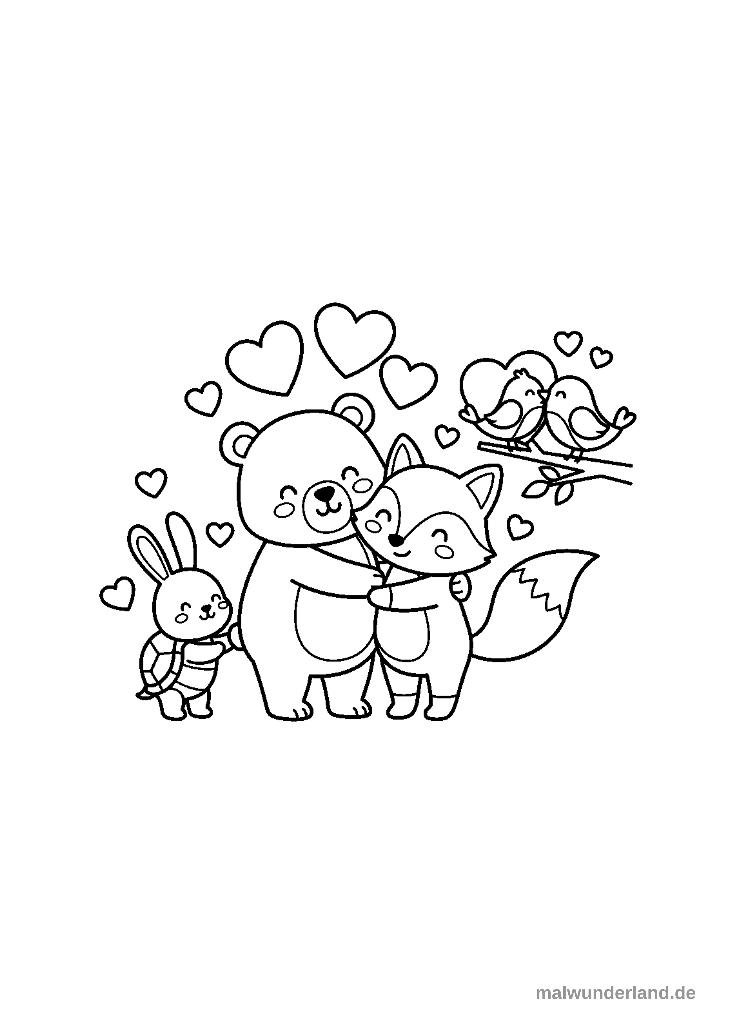 Das Ausmalbild zeigt eine Szene mit mehreren niedlichen Tieren. Ein Bär und ein Fuchs umarmen sich liebevoll in der Mitte, während ein kleiner Hase mit einem Schildkrötenpanzer sie von links berührt. Im oberen rechten Bereich sitzen zwei kleine Vögel auf einem Ast, und zahlreiche Herzen schweben um alle Tiere herum.