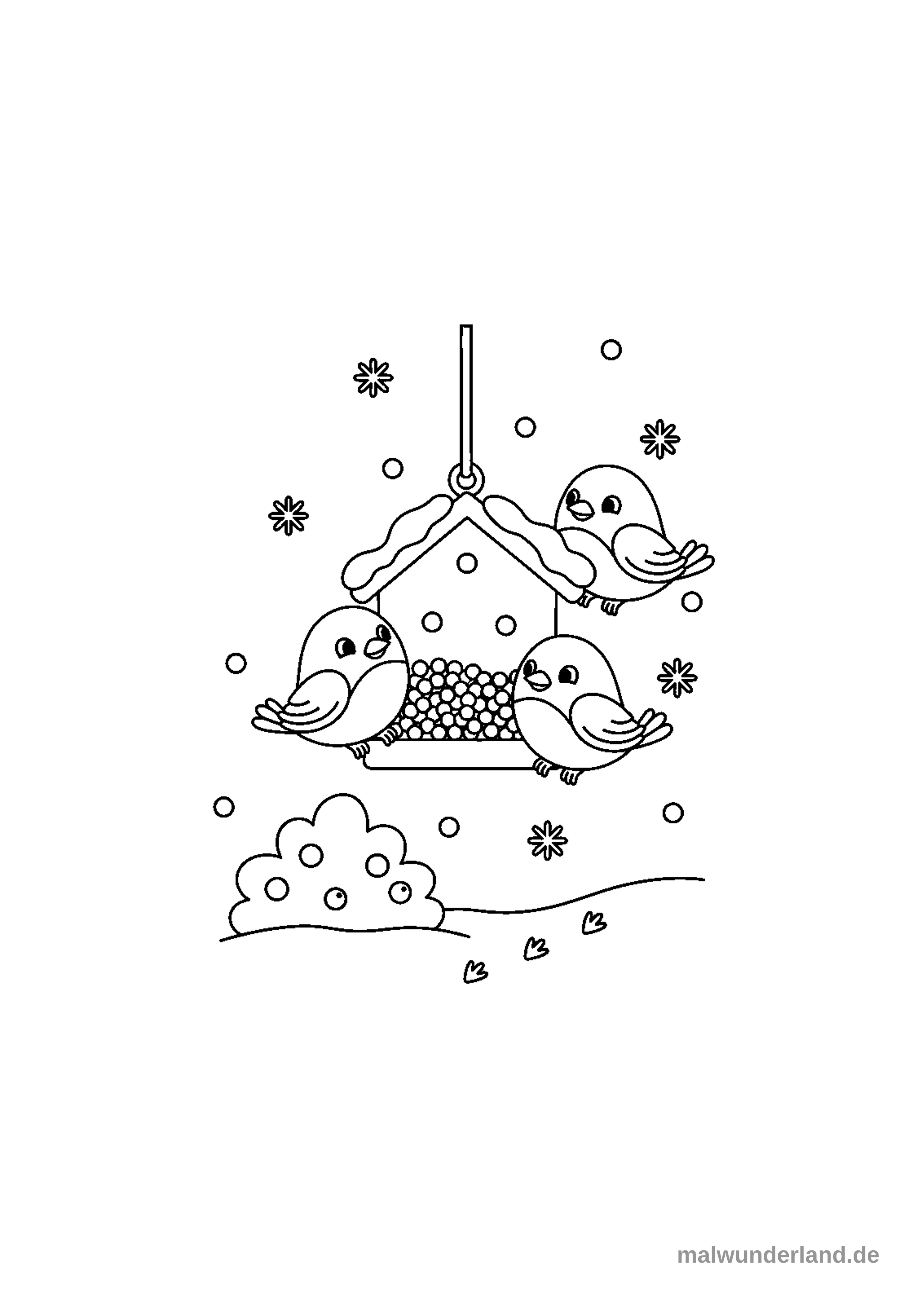 Drei niedliche Vögel sitzen um ein mit Körnern gefülltes Futterhaus, umgeben von Schnee und fallenden Schneeflocken. Im Vordergrund ist ein kleiner, beerenbesetzter Strauch mit Vogelfußspuren im Schnee zu sehen.