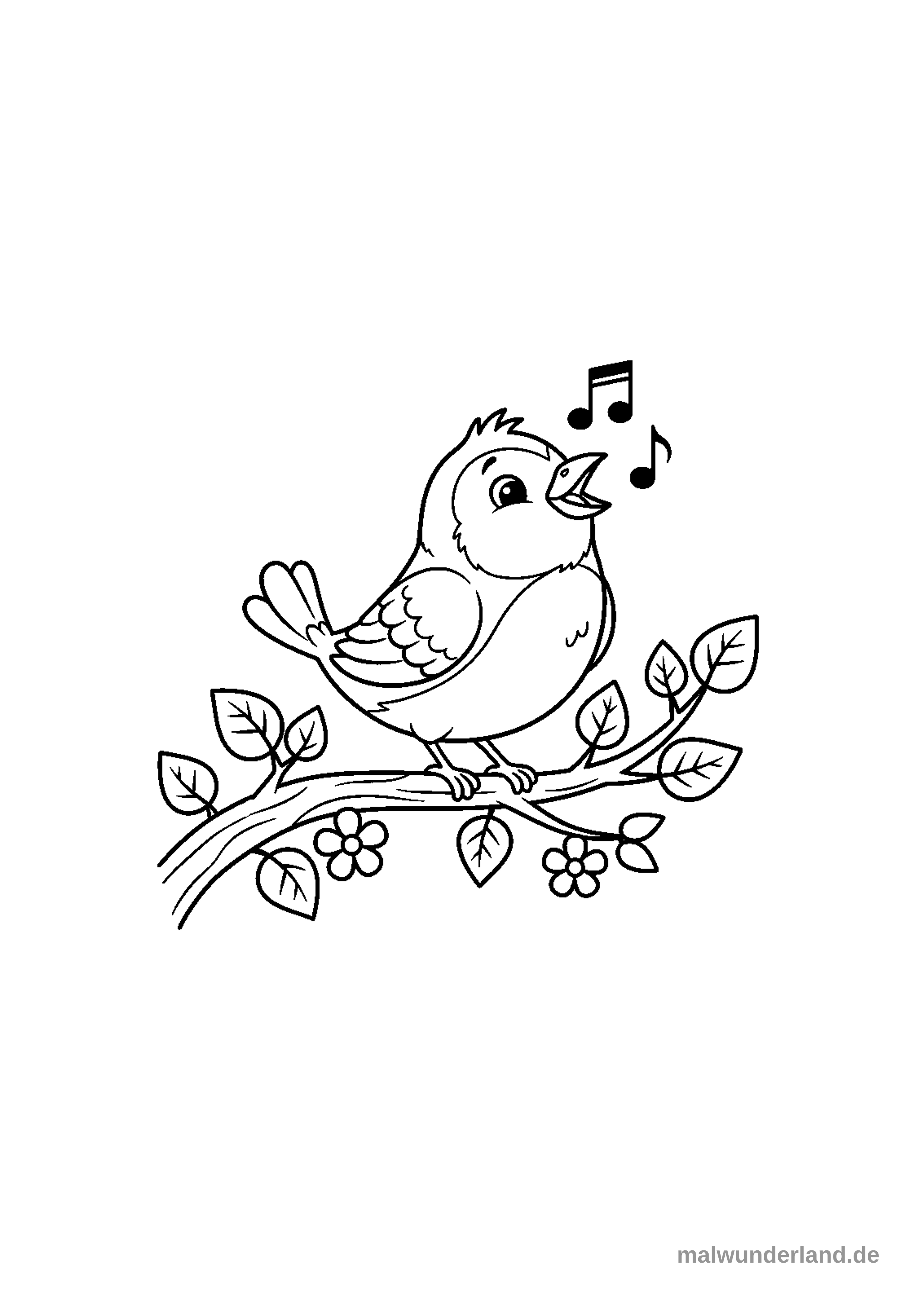 Male den Vogel in einem schönen Braunton. Sein Bauch könnte ein helleres Beige sein. Die Noten kannst du schwarz lassen oder in einem lebhaften Gelb ausmalen. Den Baumast gestaltest du in einem kräftigen Braunton. Die Blätter am Ast leuchten in verschiedenen Grüntönen, zum Beispiel hellgrün und dunkelgrün. Die kleinen Blüten kannst du in zarten Farben wie Rosa, Gelb oder Hellblau ausmalen.