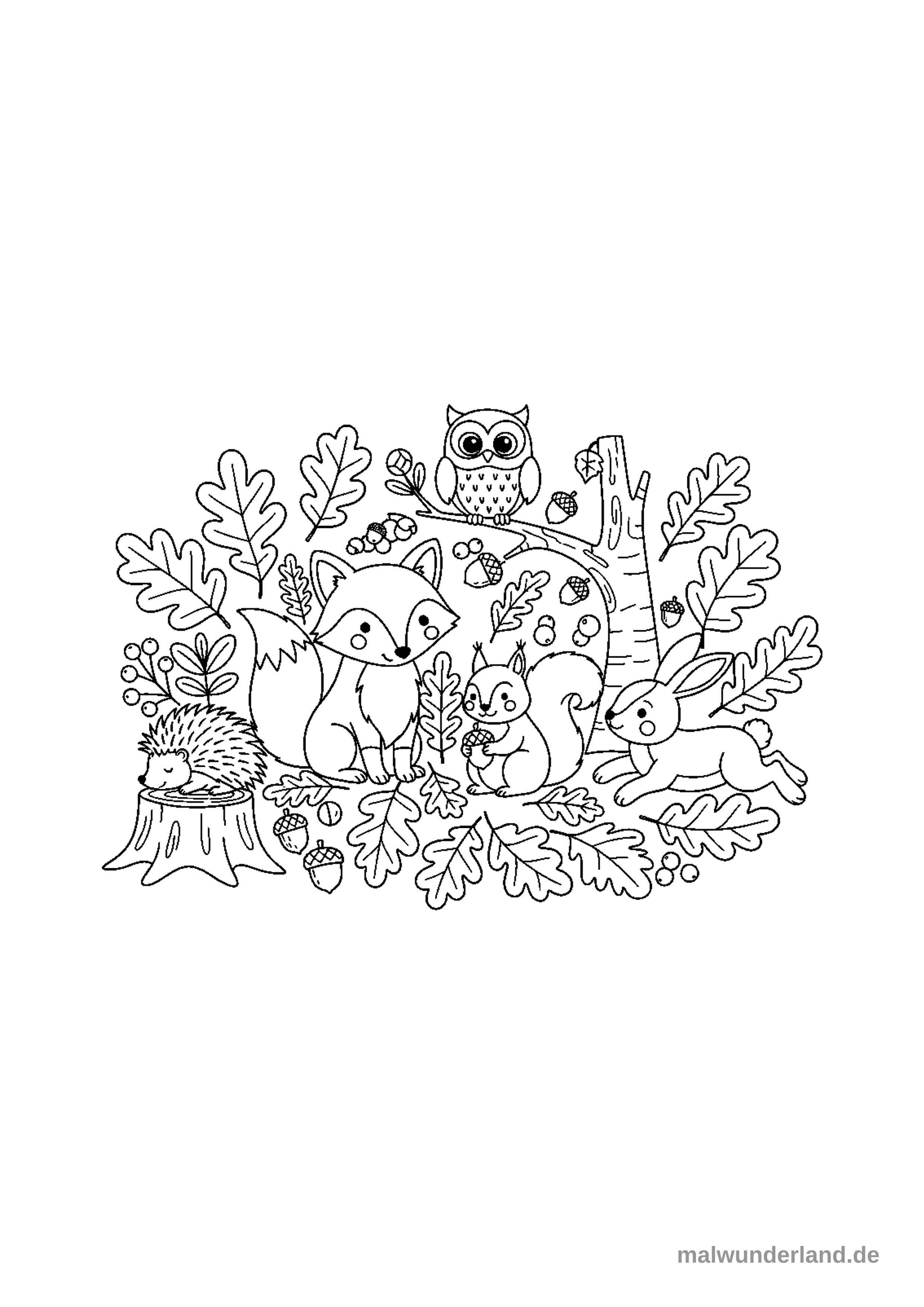 Das Ausmalbild zeigt eine lebendige Herbstszene mit fünf niedlichen Waldtieren: einem Fuchs, einem Eichhörnchen, einer Eule, einem Igel und einem Hasen. Sie sind umgeben von zahlreichen Eichenblättern, Eicheln, Beeren und Baumstämmen, die eine gemütliche Atmosphäre schaffen.