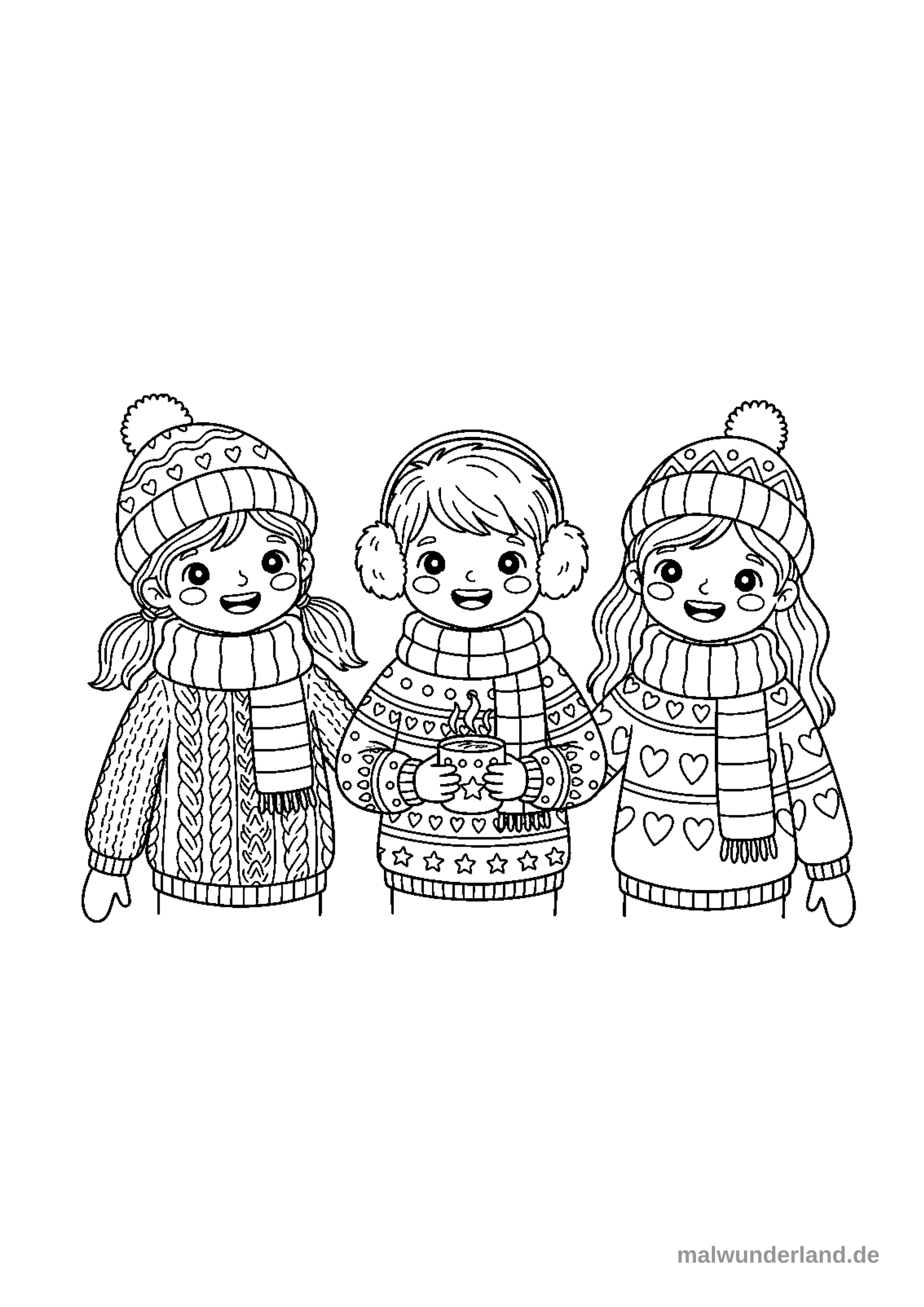 Das Ausmalbild zeigt drei lächelnde Kinder in detaillierter Winterkleidung, bestehend aus Mützen, Schals und dicken Pullovern. Das mittlere Kind hält eine dampfende Tasse in den Händen.