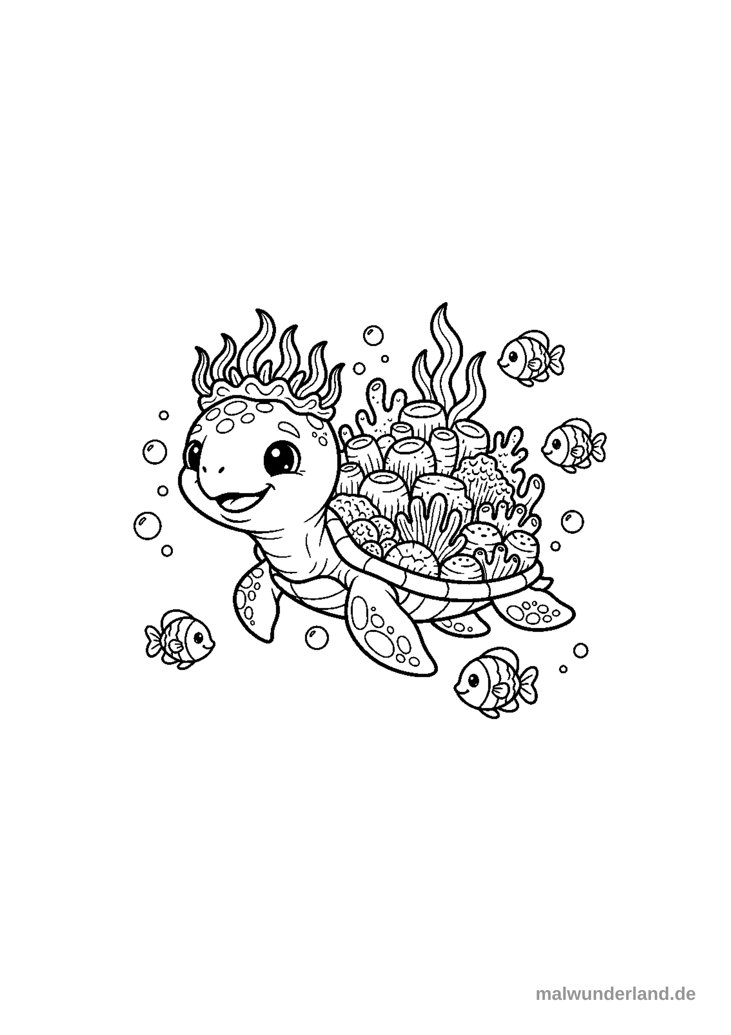 Eine alte Schildkröte mit einem Panzer aus Korallenriffen und einer Krone aus Seetang. Kleine Fische schwimmen um sie herum.