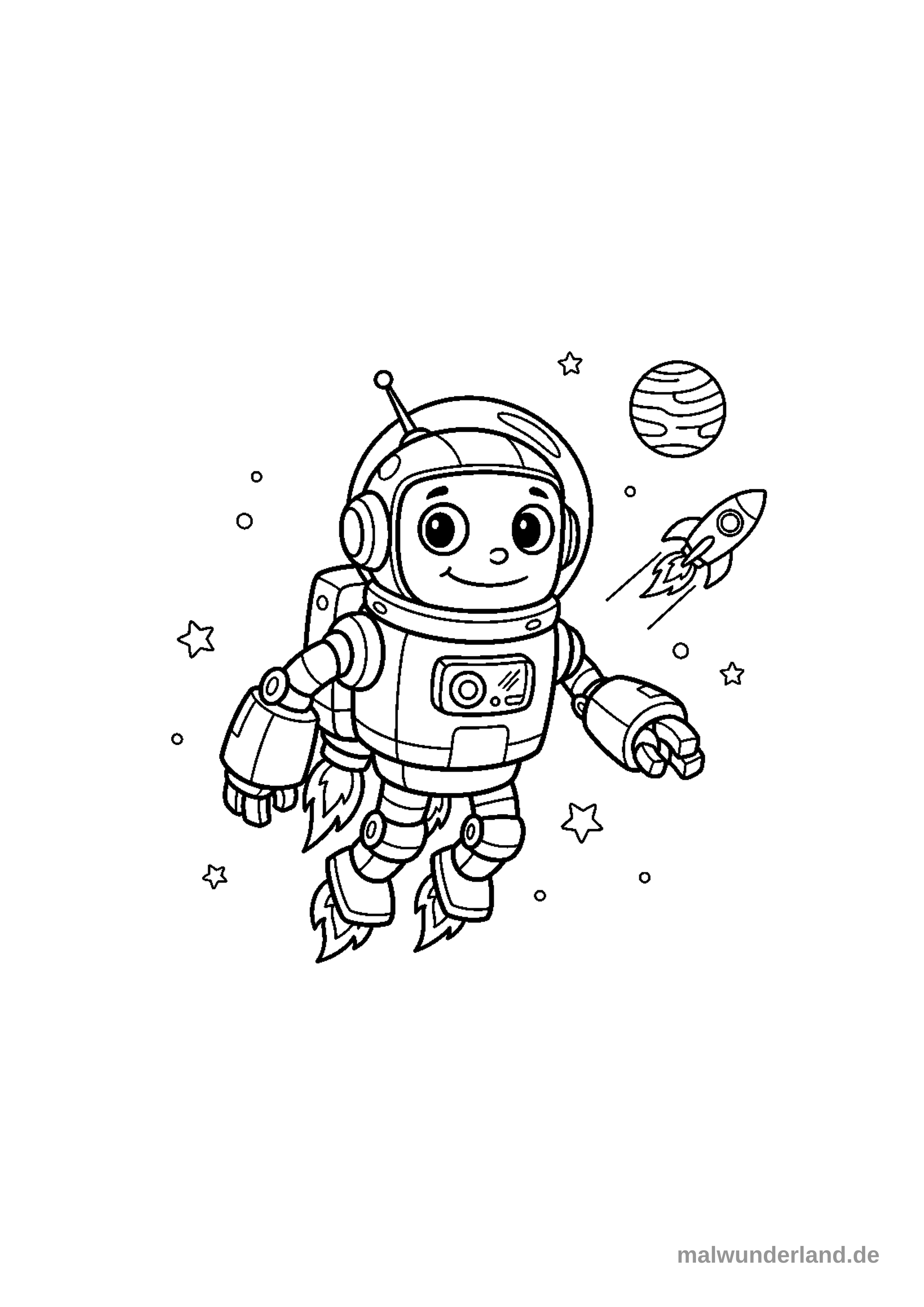 Male den Roboter-Astronauten in glänzendem Silber und seine Antenne in Rot. Der Planet im Hintergrund könnte eine Mischung aus Blau- und Grüntönen mit weißen Streifen erhalten. Die Rakete kannst du in leuchtendem Rot mit gelben Flammen gestalten. Die Sterne am Himmel könnten ein funkelndes Gelb bekommen.