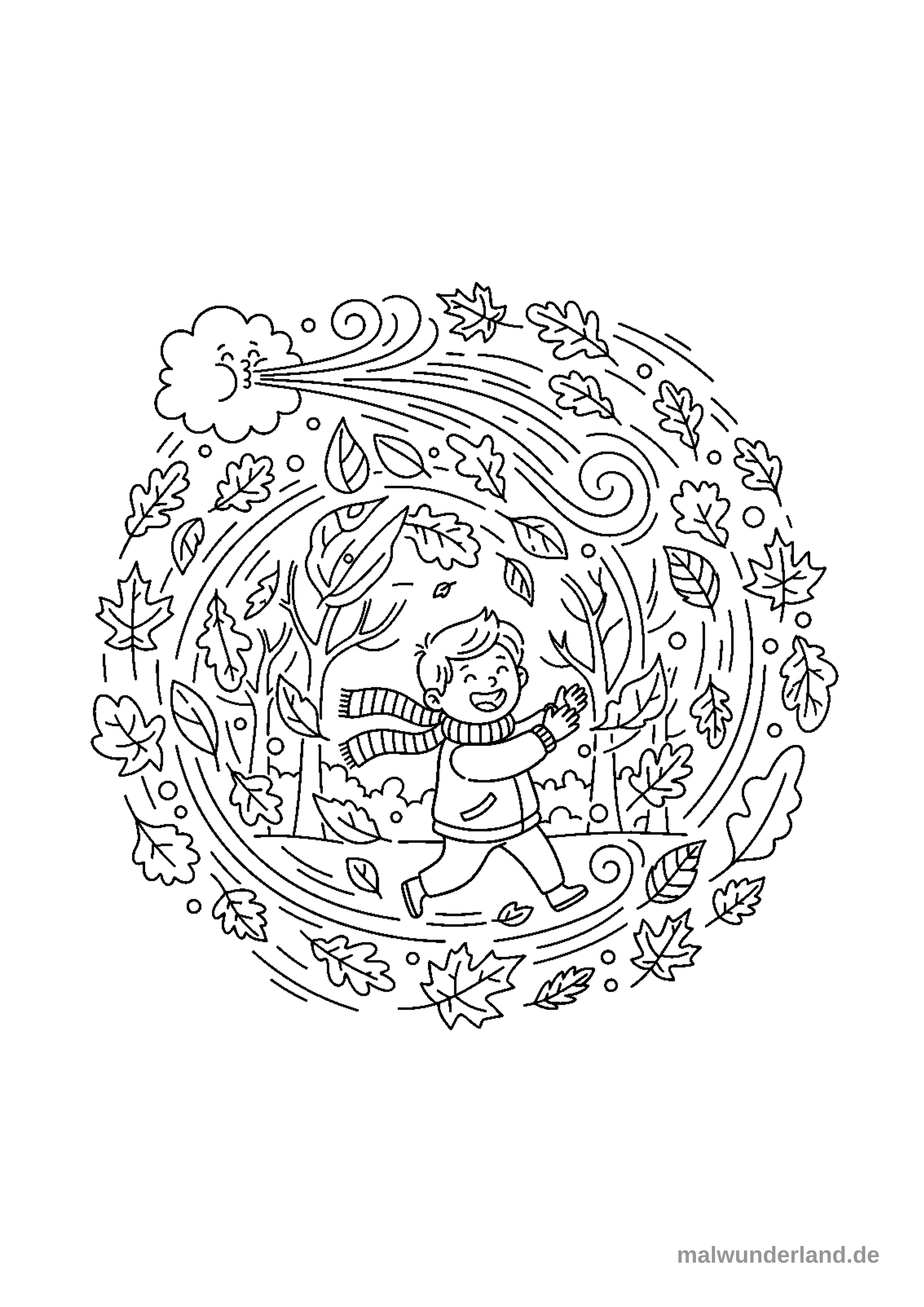Dieses Ausmalbild zeigt einen fröhlichen Jungen, der in einem Wirbel aus Herbstblättern und kahlen Ästen rennt. Eine lächelnde Wolke am oberen Rand pustet den Wind, der die Blätter in einer kreisförmigen Bewegung um den Jungen herumfliegen lässt.