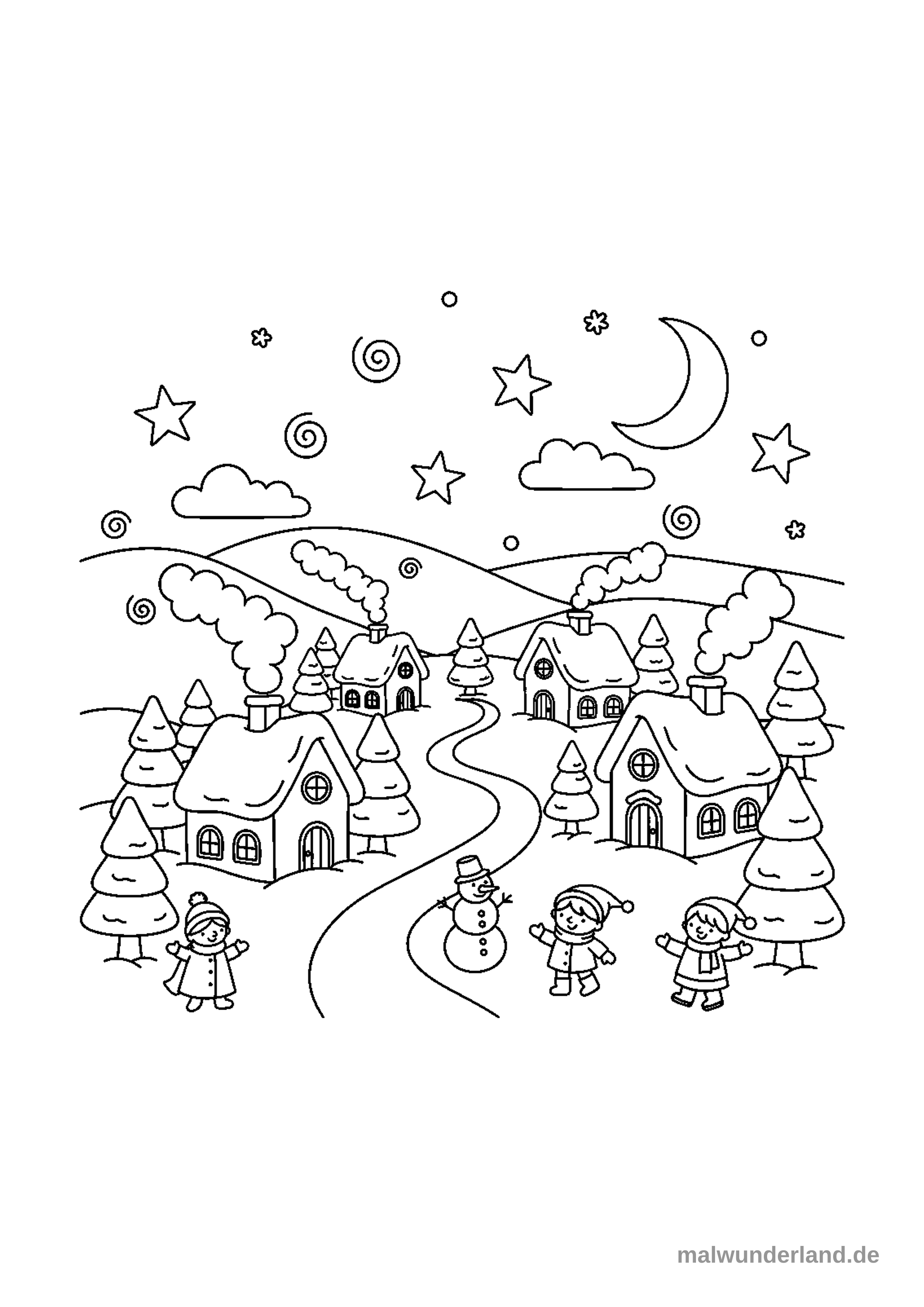 Das Ausmalbild zeigt ein idyllisches Winterdorf bei Nacht. Man sieht mehrere Häuser mit rauchenden Schornsteinen, Tannenbäume, einen gewundenen Weg sowie spielende Kinder und einen Schneemann im Vordergrund unter einem Himmel mit Mond und Sternen.