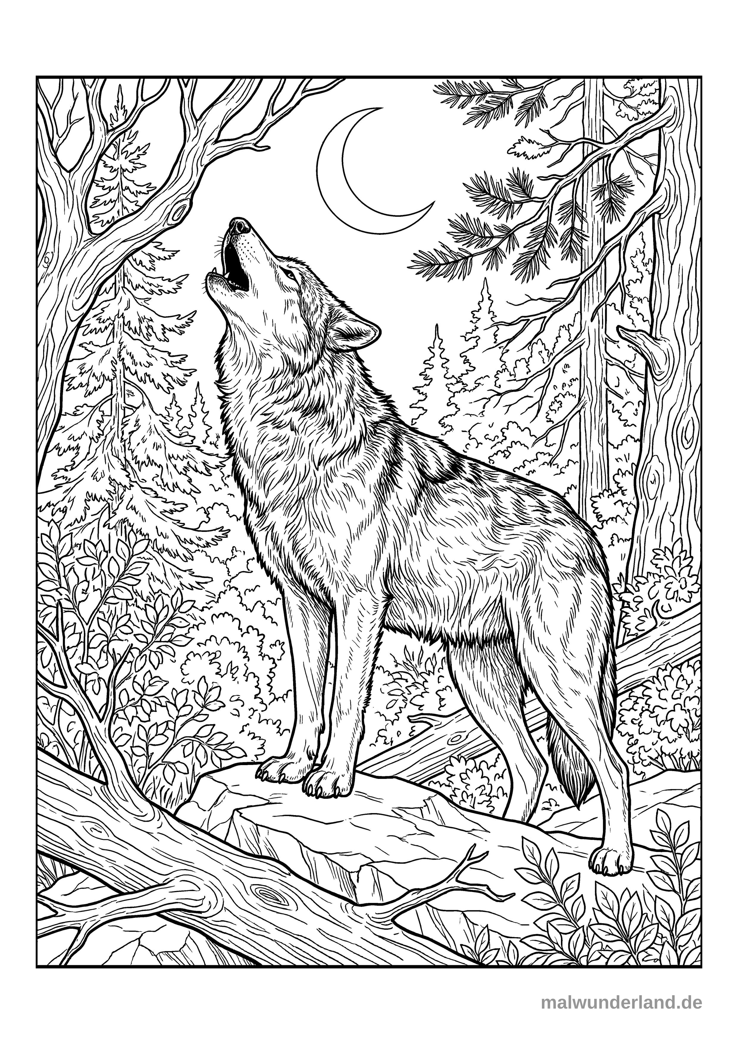 #tiere #wildtiere #natur #realistisch #ausmalen #detailreich #tierwelt #Wolf #Wald #Mond #Bäume #Felsen #Äste #Nadelbäume #Büsche #heulen #beobachten #stehen