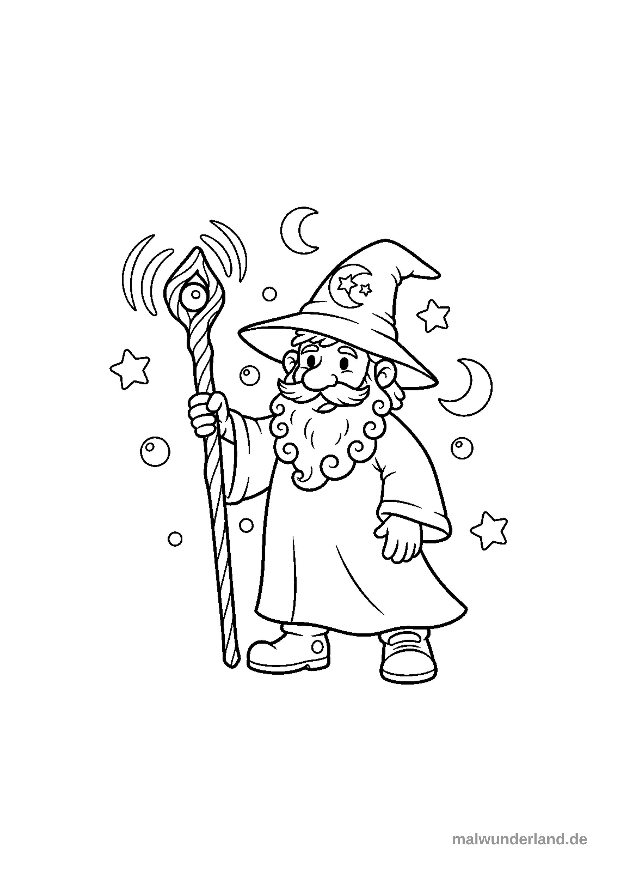 Ein freundlicher Zeichentrick-Zauberer mit einem großen spitzen Hut und langem Bart steht da und hält einen magischen Stab mit leuchtenden Wellen. Um ihn herum schweben Sterne, Monde und kleine Kugeln, die eine zauberhafte Atmosphäre schaffen.