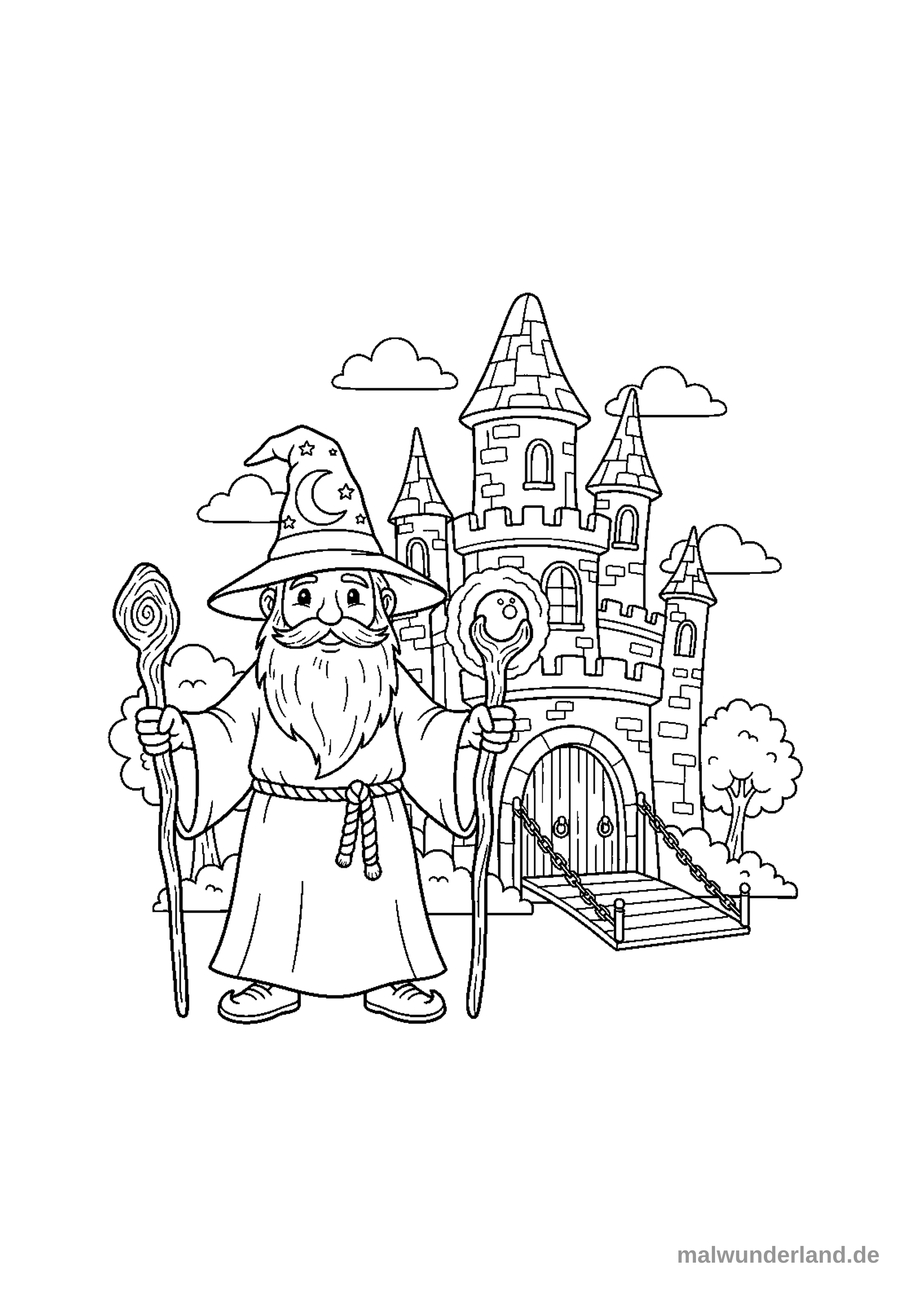 Das Ausmalbild zeigt einen freundlich aussehenden Zauberer mit Spitzhut, langem Bart und zwei Zauberstäben. Im Hintergrund steht eine große Burg mit mehreren Türmen, Zinnen und einer geöffneten Zugbrücke.